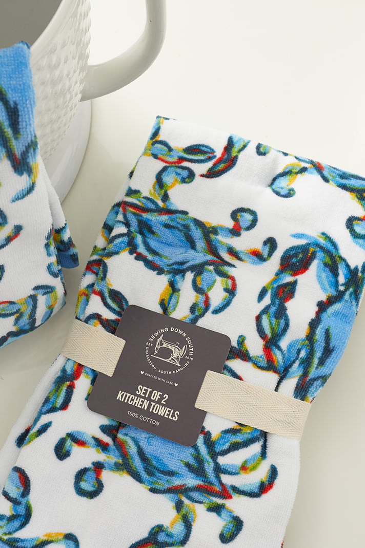 *SEW NEW* Our Crab Craze Oversized Kitchen Towels go to work in a perfectly paired two-pack. 100% cotton, these kitchen towels are soft + plush while still being absorbent.