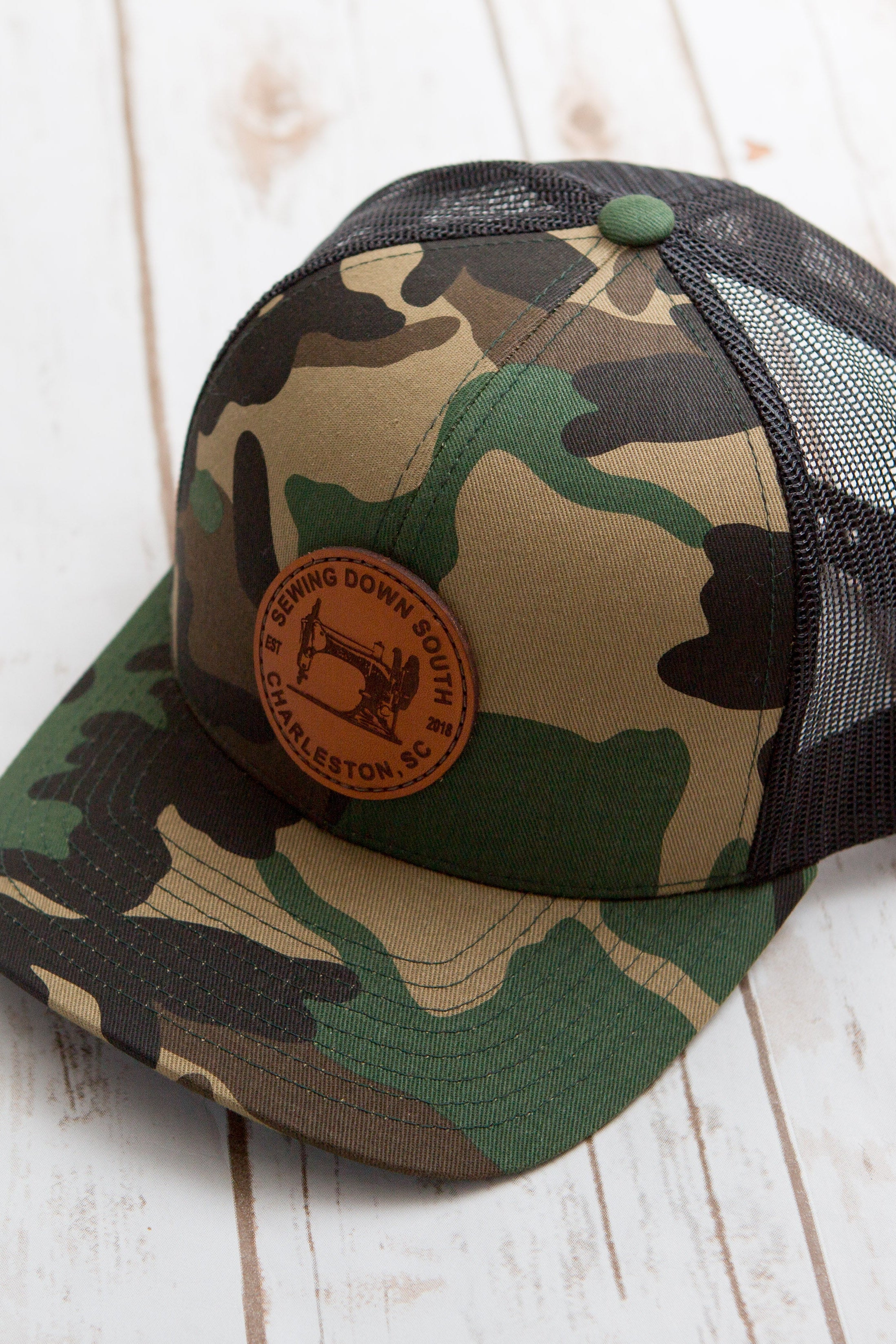 Text in cursive reads “we’re sew glad you’re here,” centered on a gray-blue plaid background with dashed lines and a dark blue shape outlining the text.