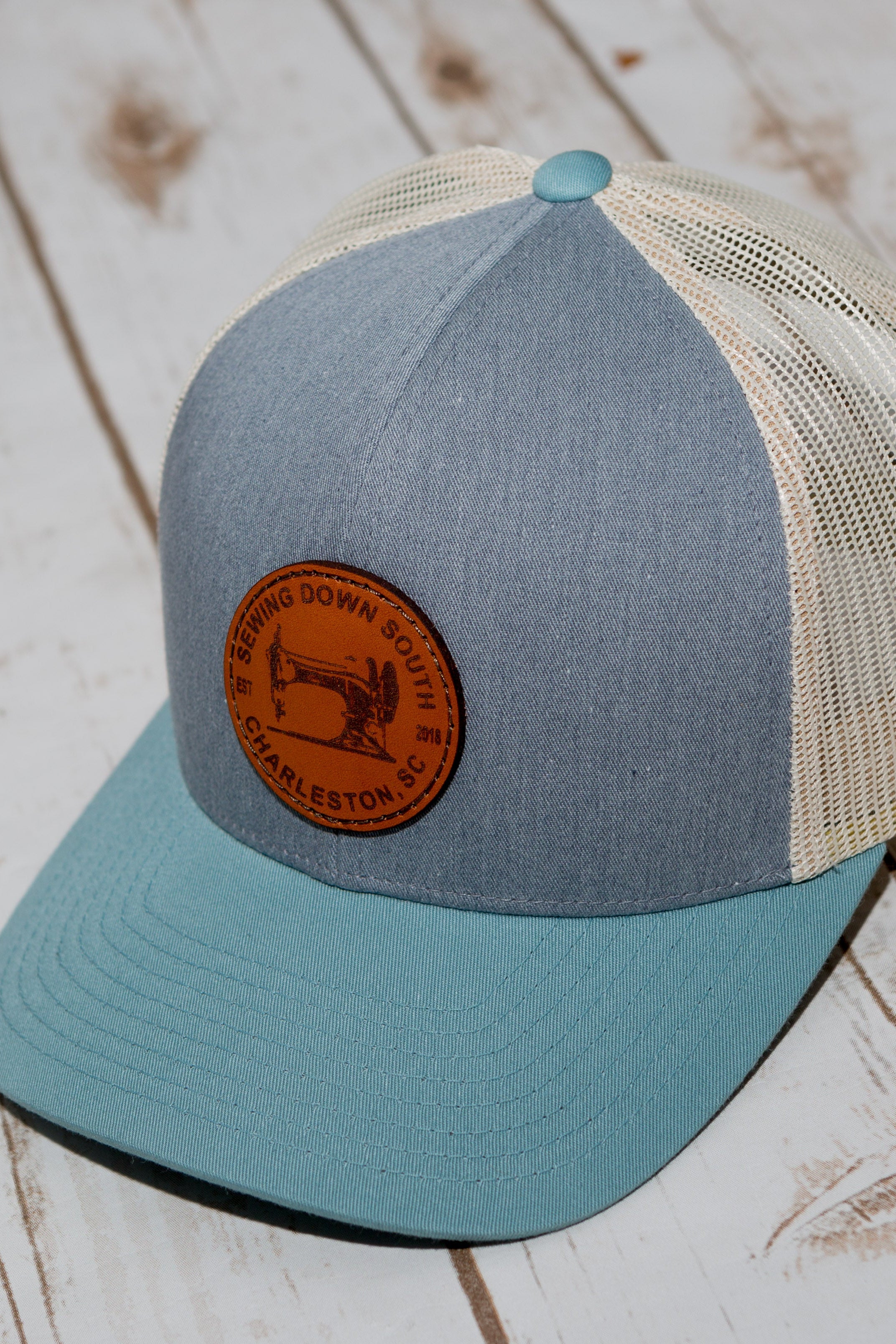 A blue and white plaid background with the phrase “were sew glad you’re here” in cursive, displayed in dark blue with a white outline.