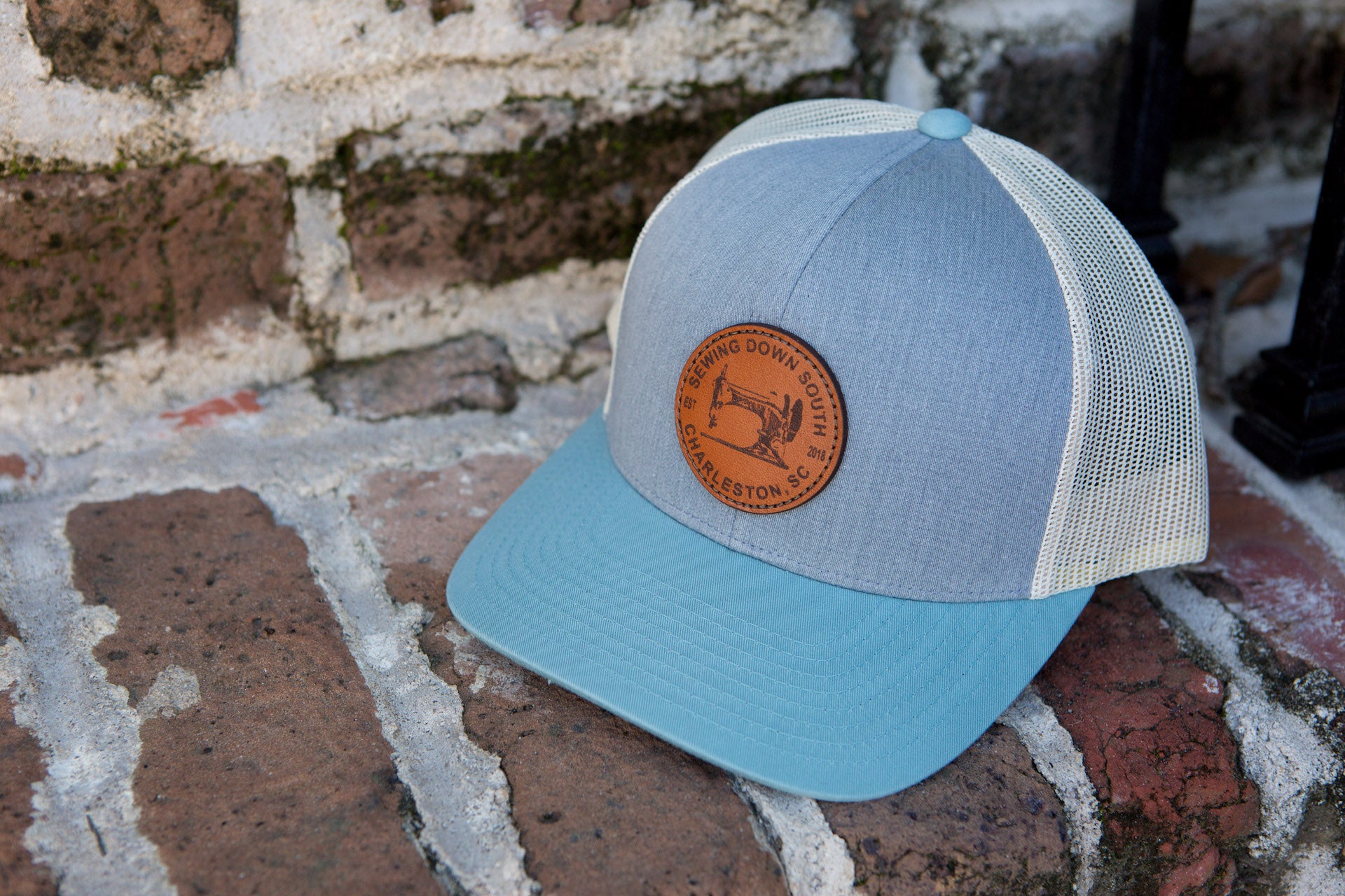 Text in cursive reads “we’re sew glad you’re here,” centered on a gray-blue plaid background with dashed lines and a dark blue shape outlining the text.
