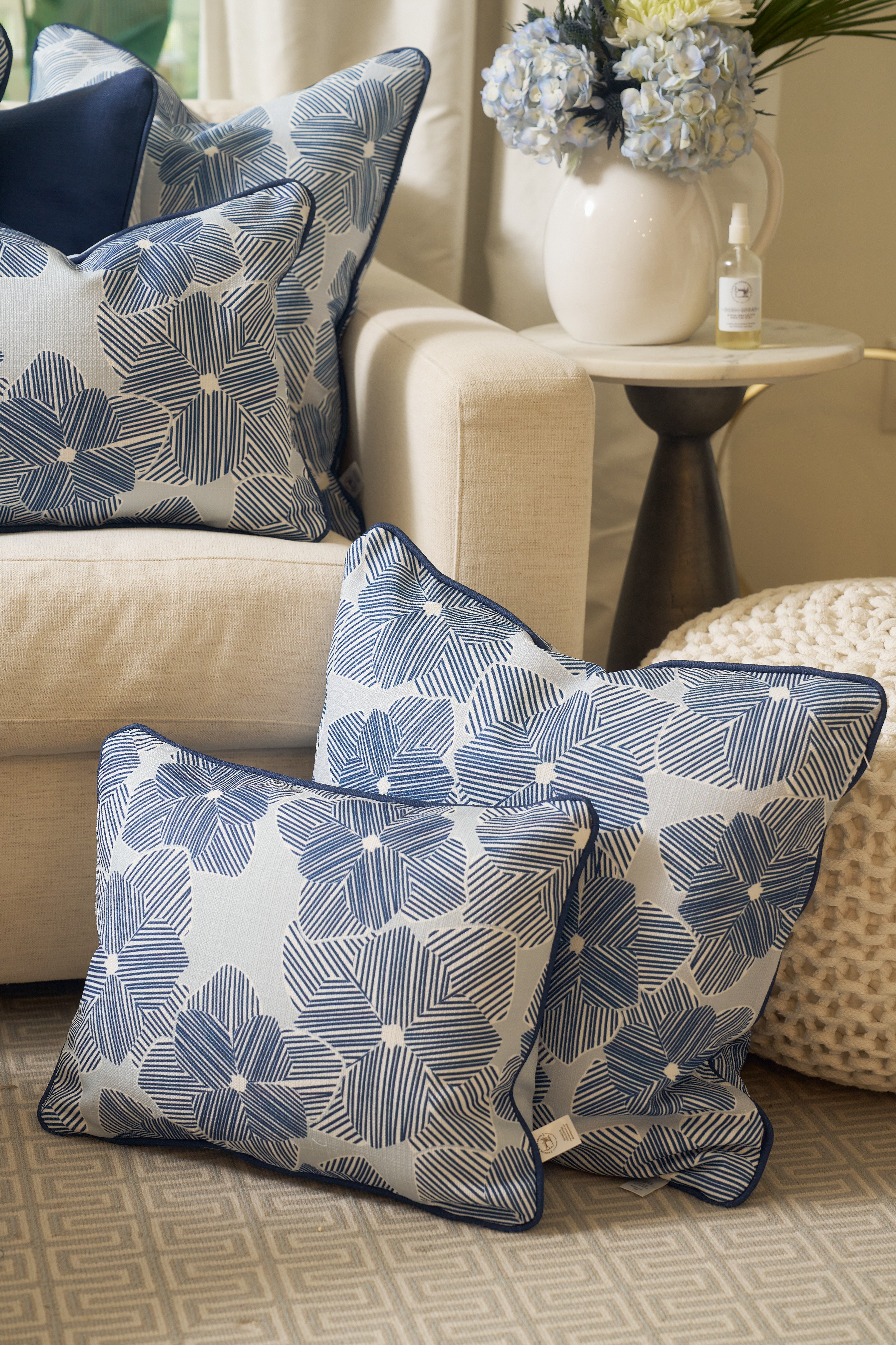 Our Mod Flora Lumbar Pillow delivers a pop of pattern with modern flair. With contrasting shades of blue, this pillow is sure to shine in any space. In a substantial twill-like woven fabric, we finished this pillow with a complementary welt, but bold navy welt.