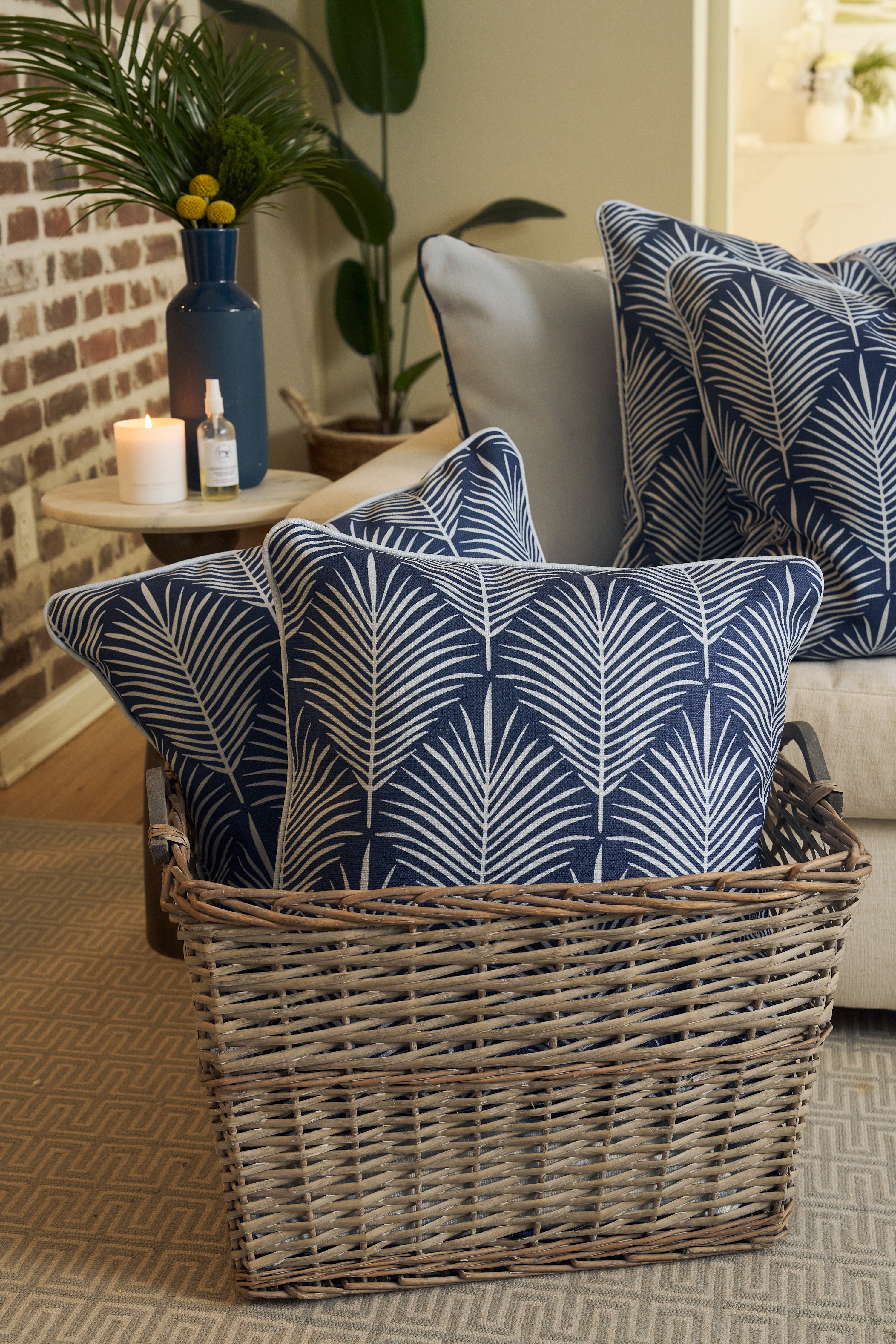 Our Oversized Mod Palm Pillow delivers a pop of palm pattern with modern flair. With contrasting shades of blue, this pillow is sure to shine in any space. In a substantial twill-like woven fabric, we finished this pillow with a complementary welt, but bold light blue welt.
