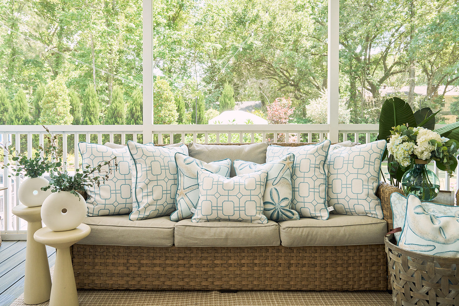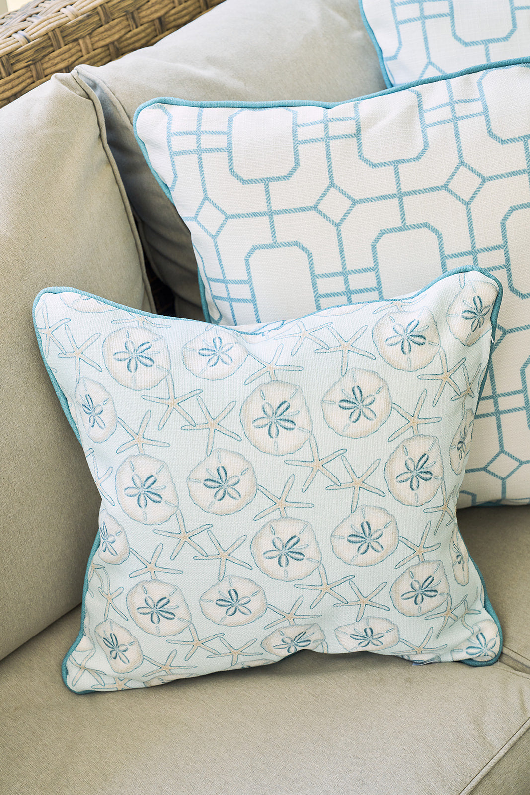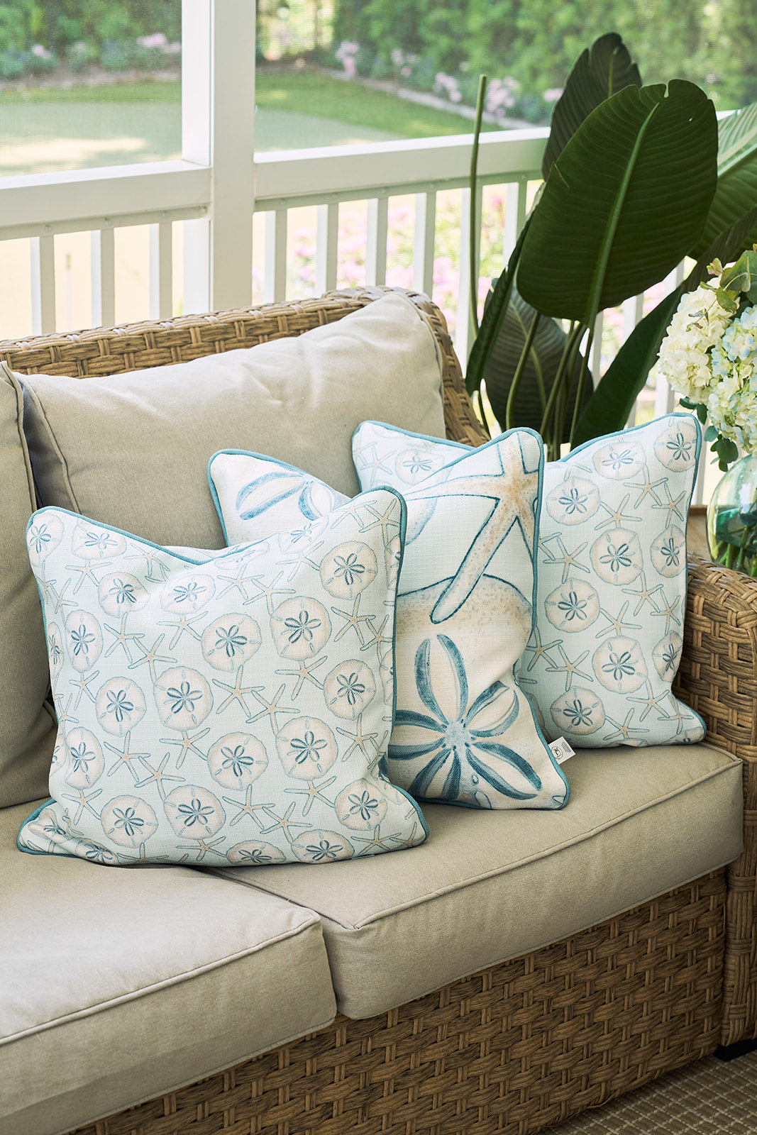Two-sided: starfish and sand dollar design on the front, soft coastal motif on the flip side with a beautiful coordinating welt. Pair this pillow with our Beach Oversized Lattice Pillow to complete the look.