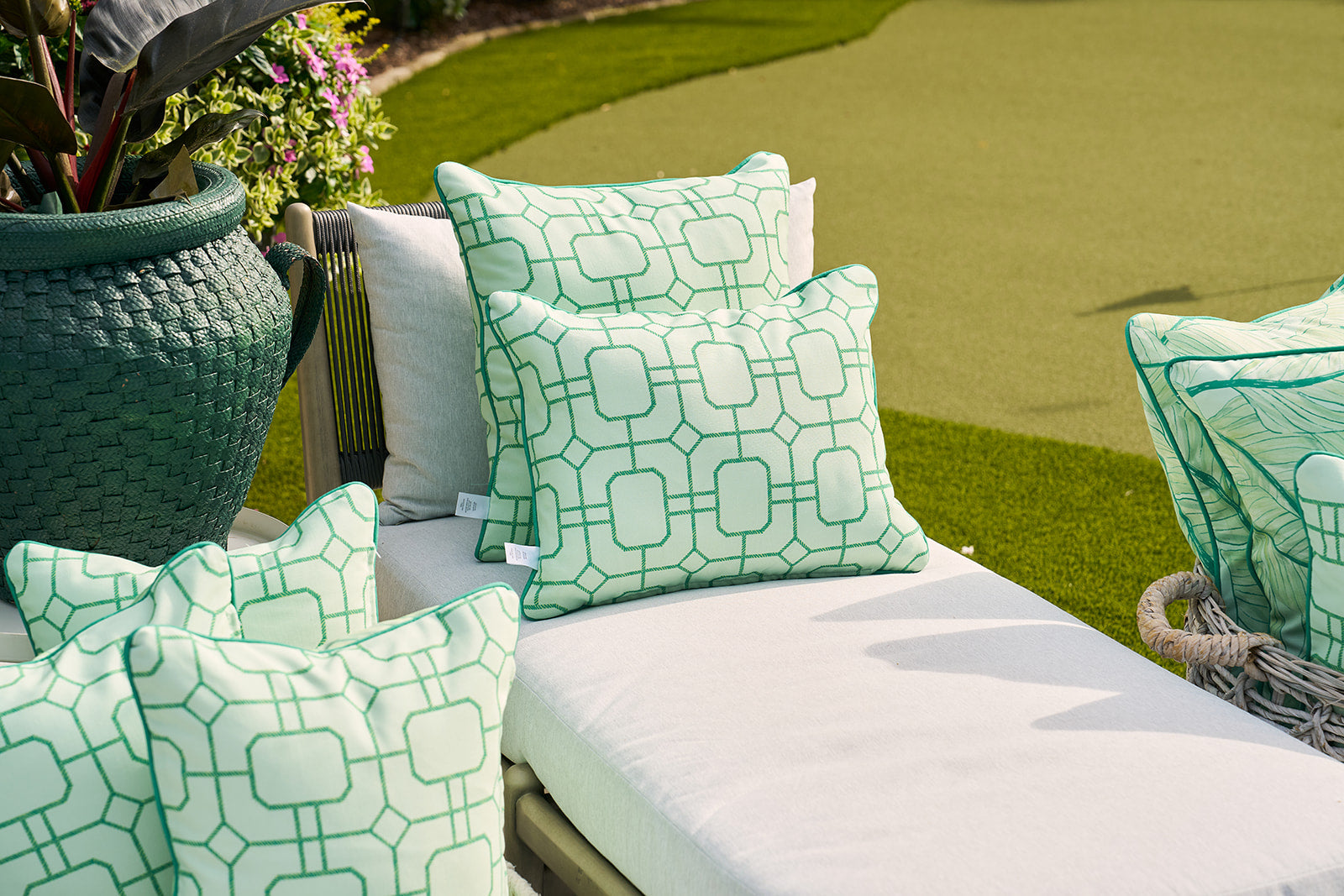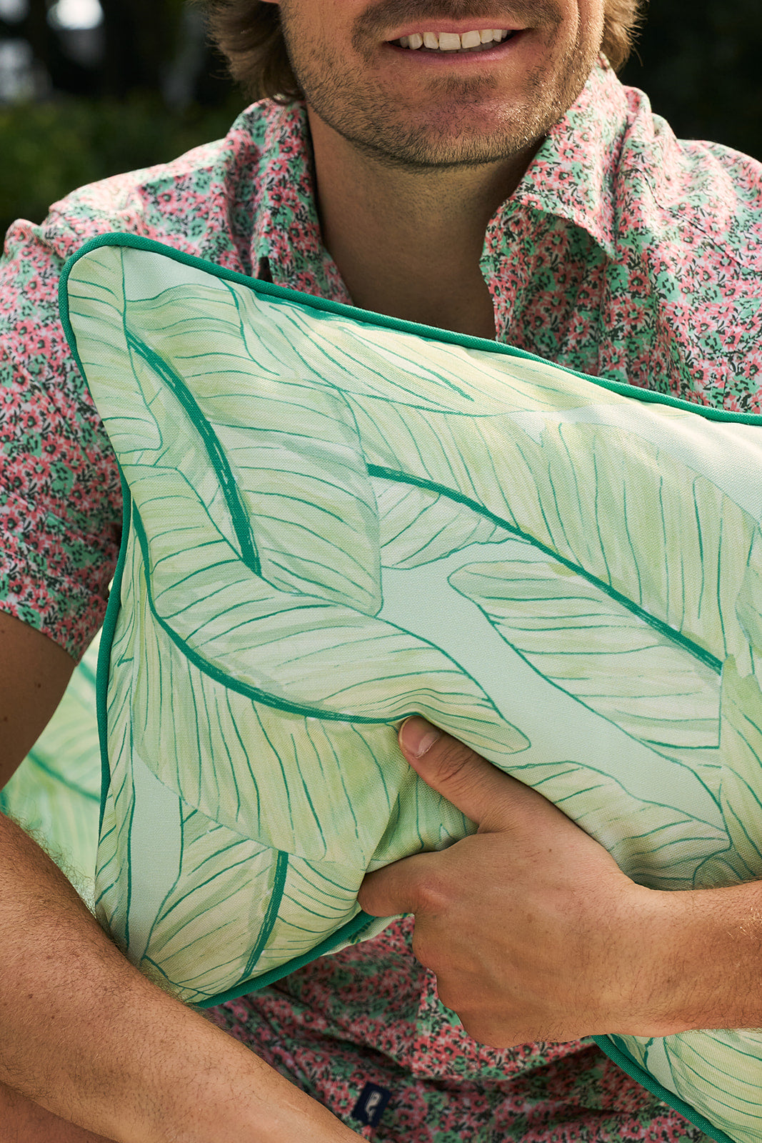 Created with SDS Shield® Outdoor Fabric that is designed for performance, our Green Lattice print is featured on one side and our Banana Leaves print is featured on the other. Finished with a bold green complimentary welt, this lumbar pillow pairs perfectly with our Banana Leaves Pillow.
