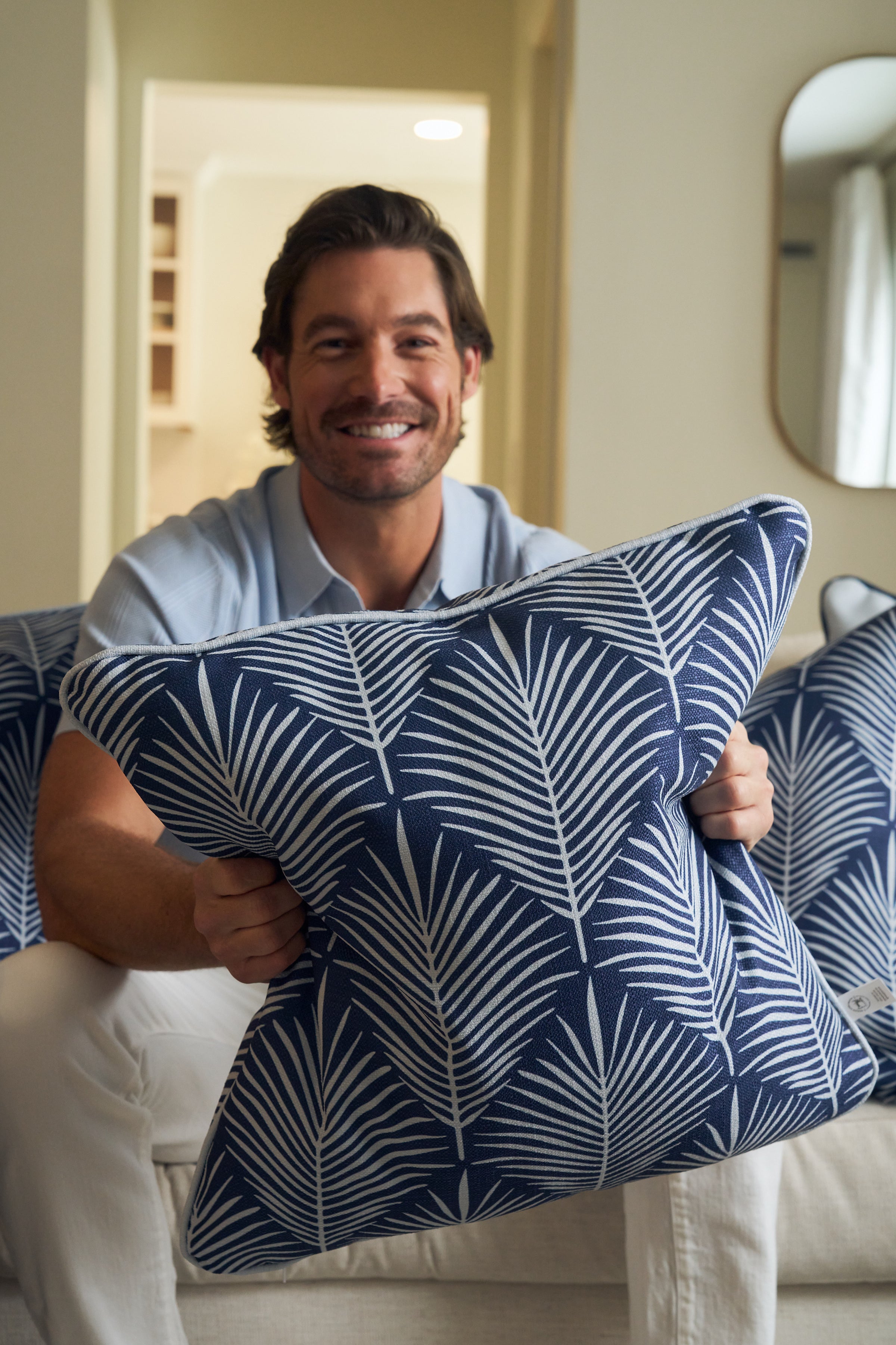 Our Oversized Mod Palm Pillow delivers a pop of palm pattern with modern flair. With contrasting shades of blue, this pillow is sure to shine in any space. In a substantial twill-like woven fabric, we finished this pillow with a complementary welt, but bold light blue welt.