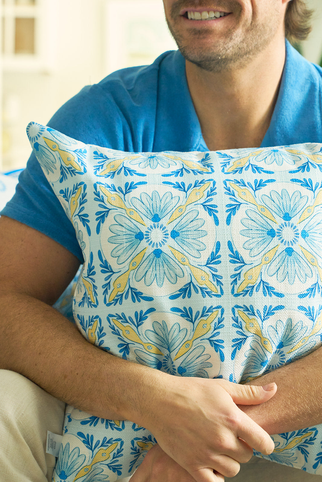 Add a burst of fresh color and cozy charm to any space with the Euro Blue Tiles Pillow.