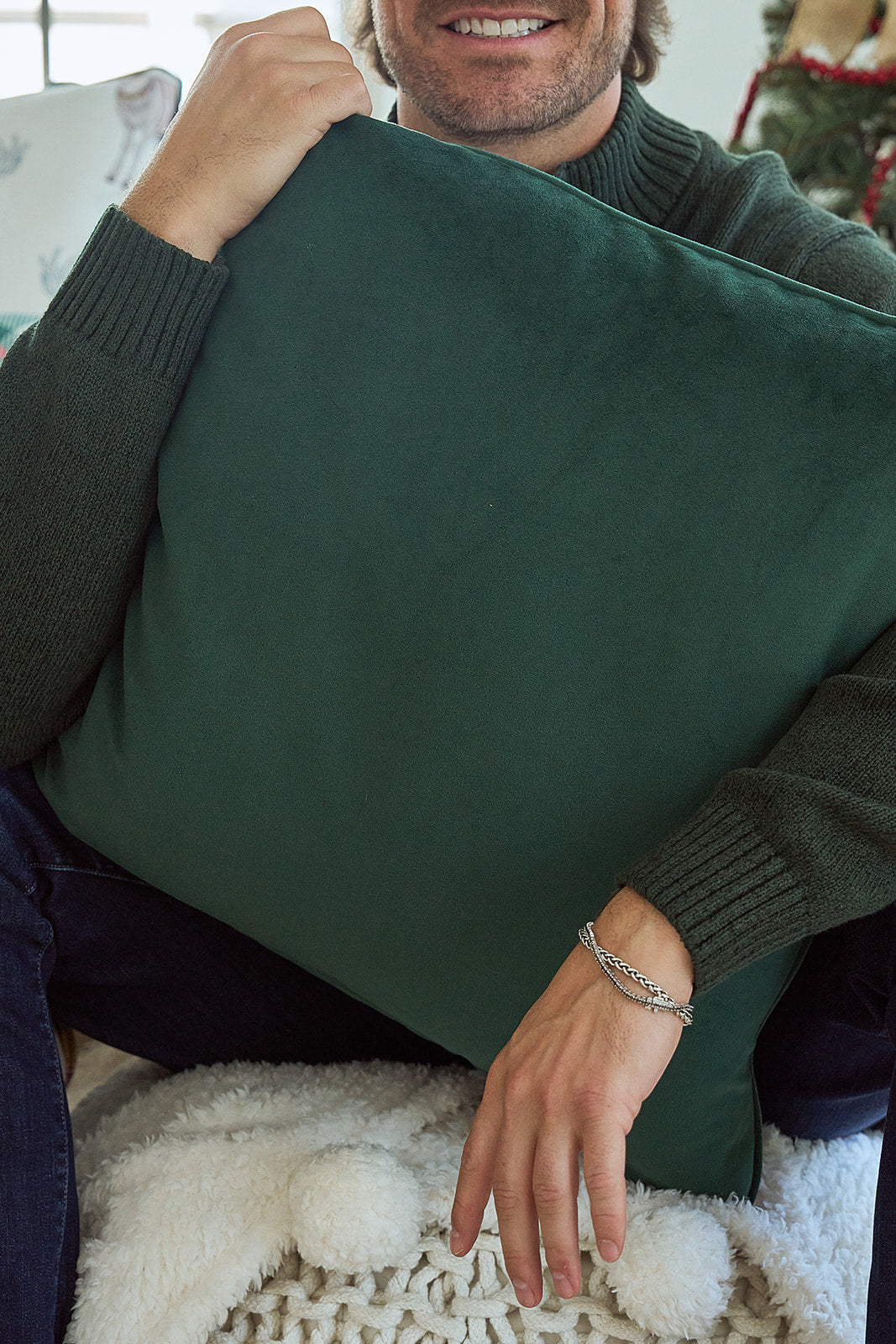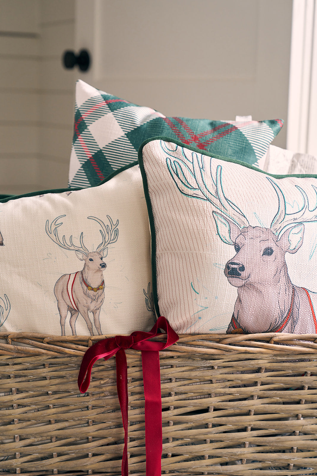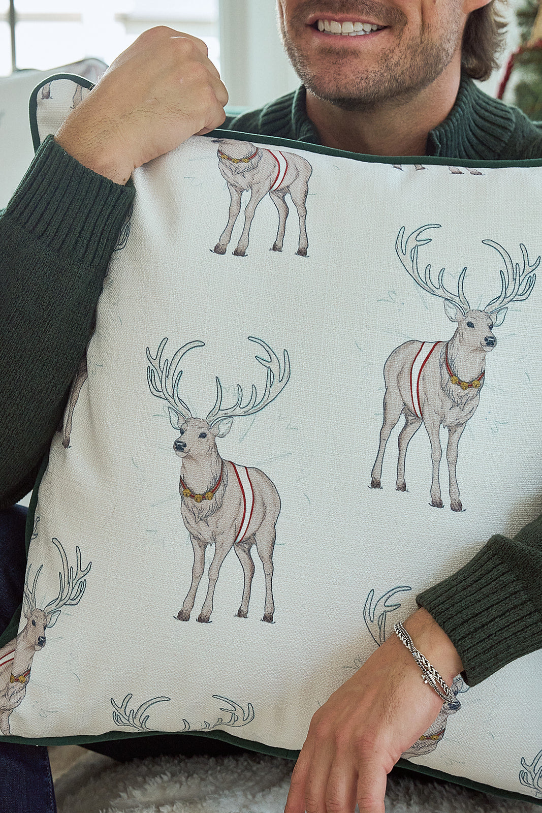 TWO PILLOWS IN ONE: an elevated take on an SDS Reindeers with an all-new spruce green velvet back with spruce velvet accent welt.