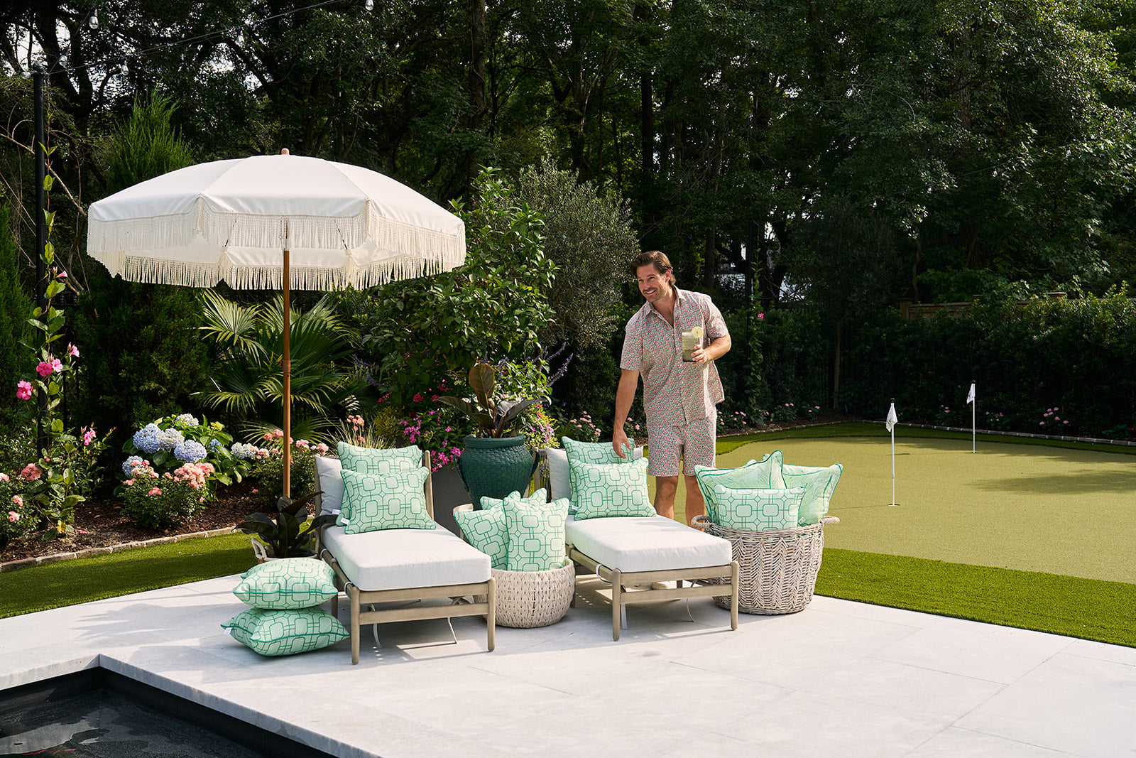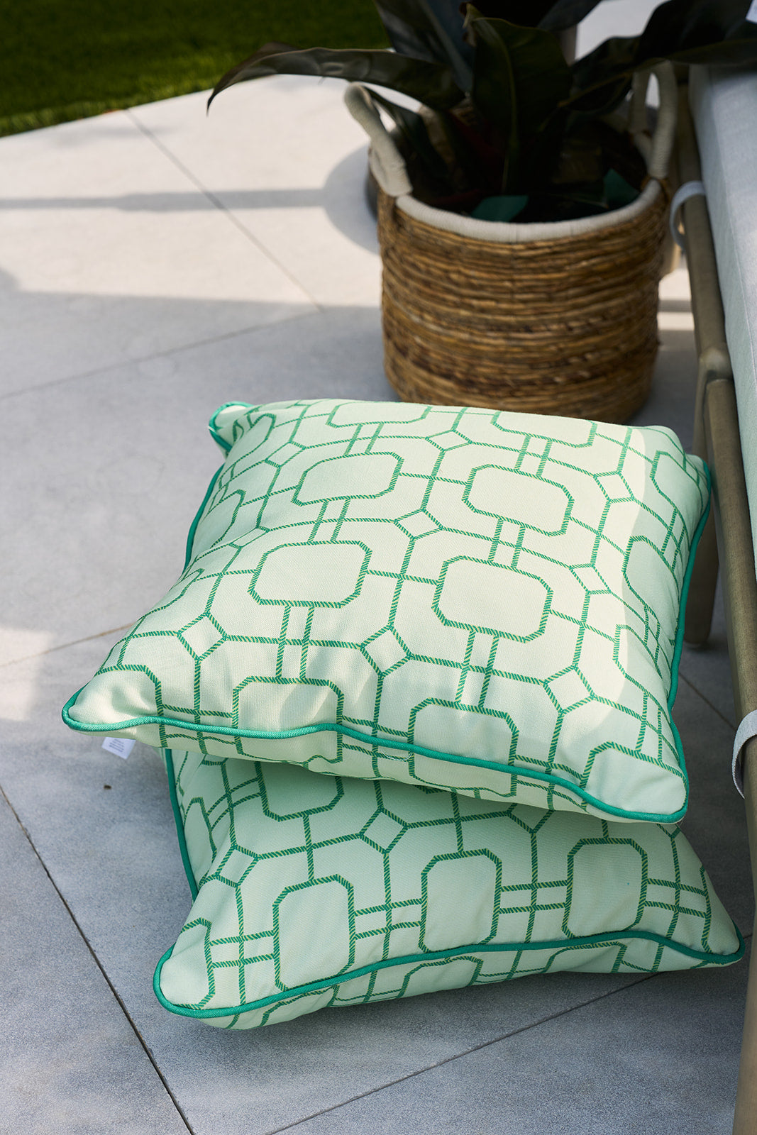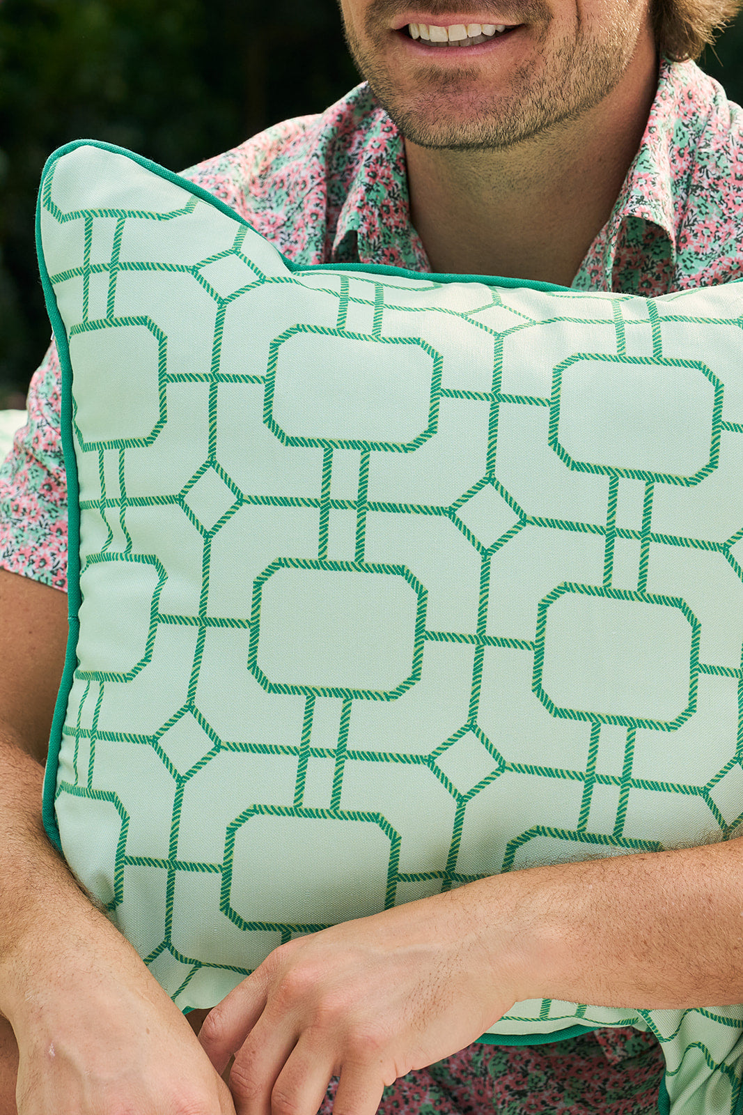 Text in cursive reads “we’re sew glad you’re here,” centered on a gray-blue plaid background with dashed lines and a dark blue shape outlining the text.