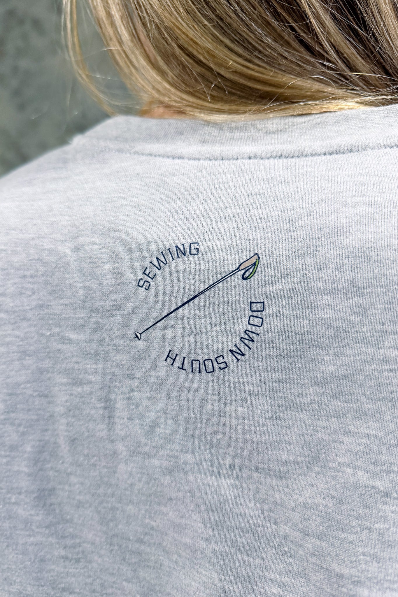 Text in cursive reads “we’re sew glad you’re here,” centered on a gray-blue plaid background with dashed lines and a dark blue shape outlining the text.