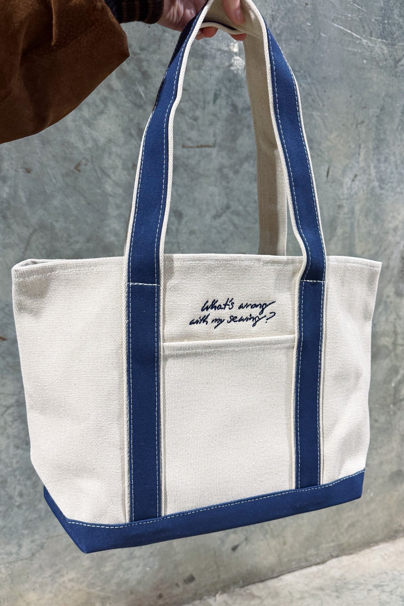 Our 'What's wrong with my sewing' Embroidered Canvas Tote is back, but now in Craig's Handwriting!