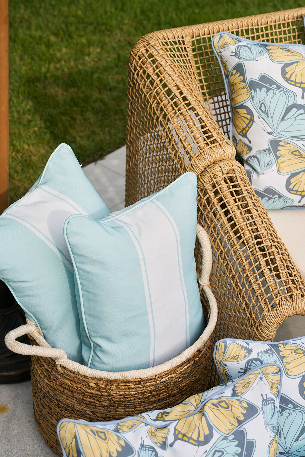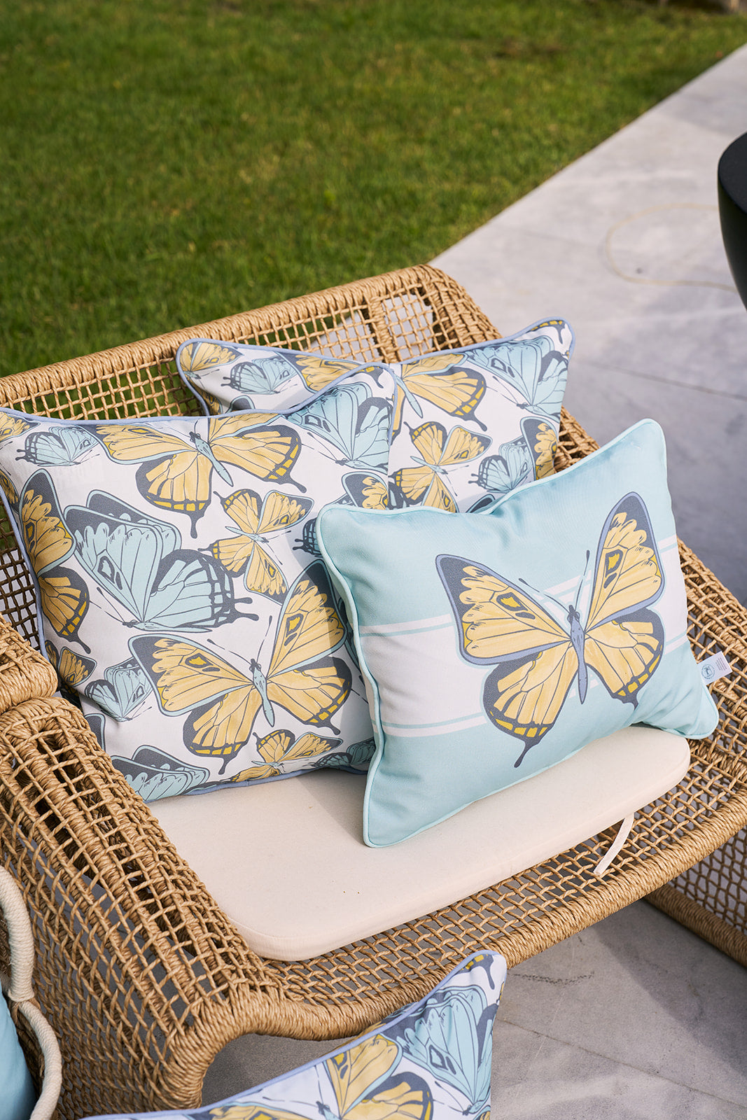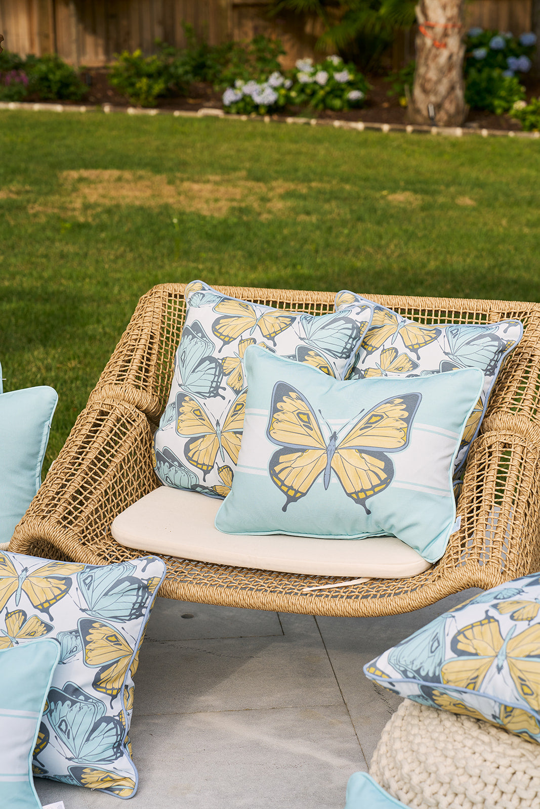 Designed to pair perfectly with our Scattered Butterfly Outdoor Pillow - this outdoor lumbar pillow is finished with a coordinating teal welt to bring in an element of elevated color.