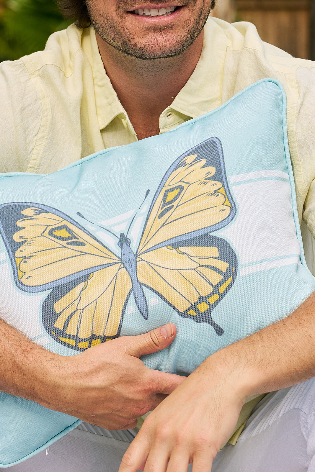We've got the the butterflies over our new Butterfly Stripe Lumbar Outdoor Pillow. This double-sided lumbar pillow features a our single butterfly on one side, with a complementary stripe pattern on the other.