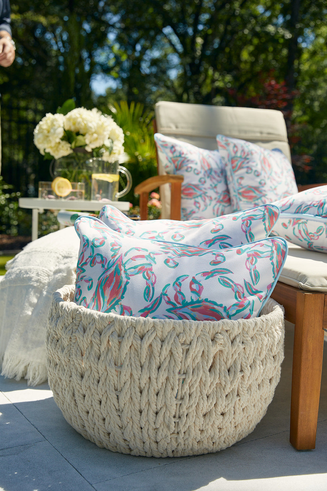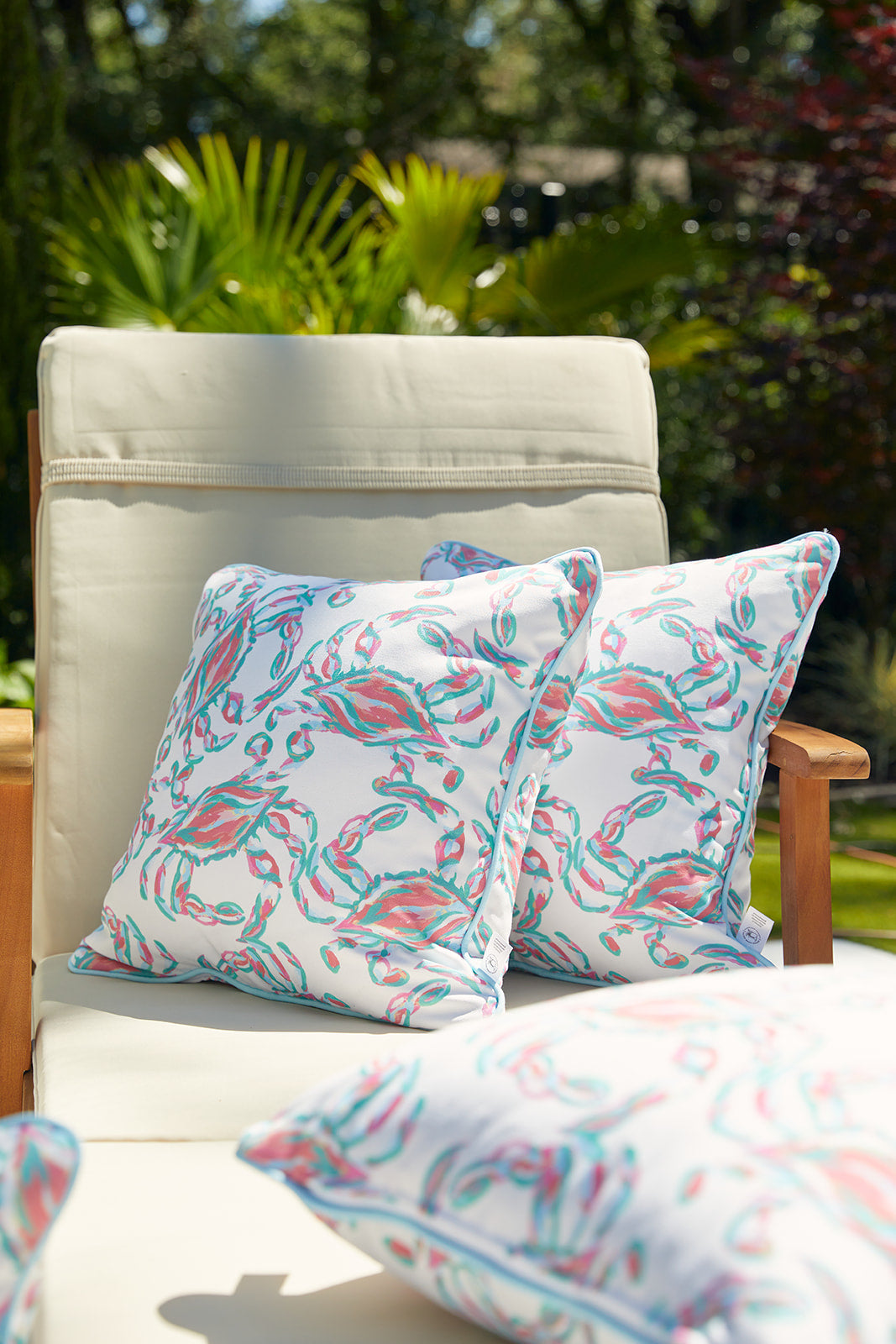 Our Coral Crab Craze Outdoor Pillow will add unexpected color and brightness to any space. Created with SDS Shield® Outdoor Fabric that is designed for performance, we finished it with a coordinating Carolina Blue welt. Pairs sew perfectly with our Outdoor Coral King Crab Pillow + our Coral Crab Craze Lumbar Outdoor Pillow.