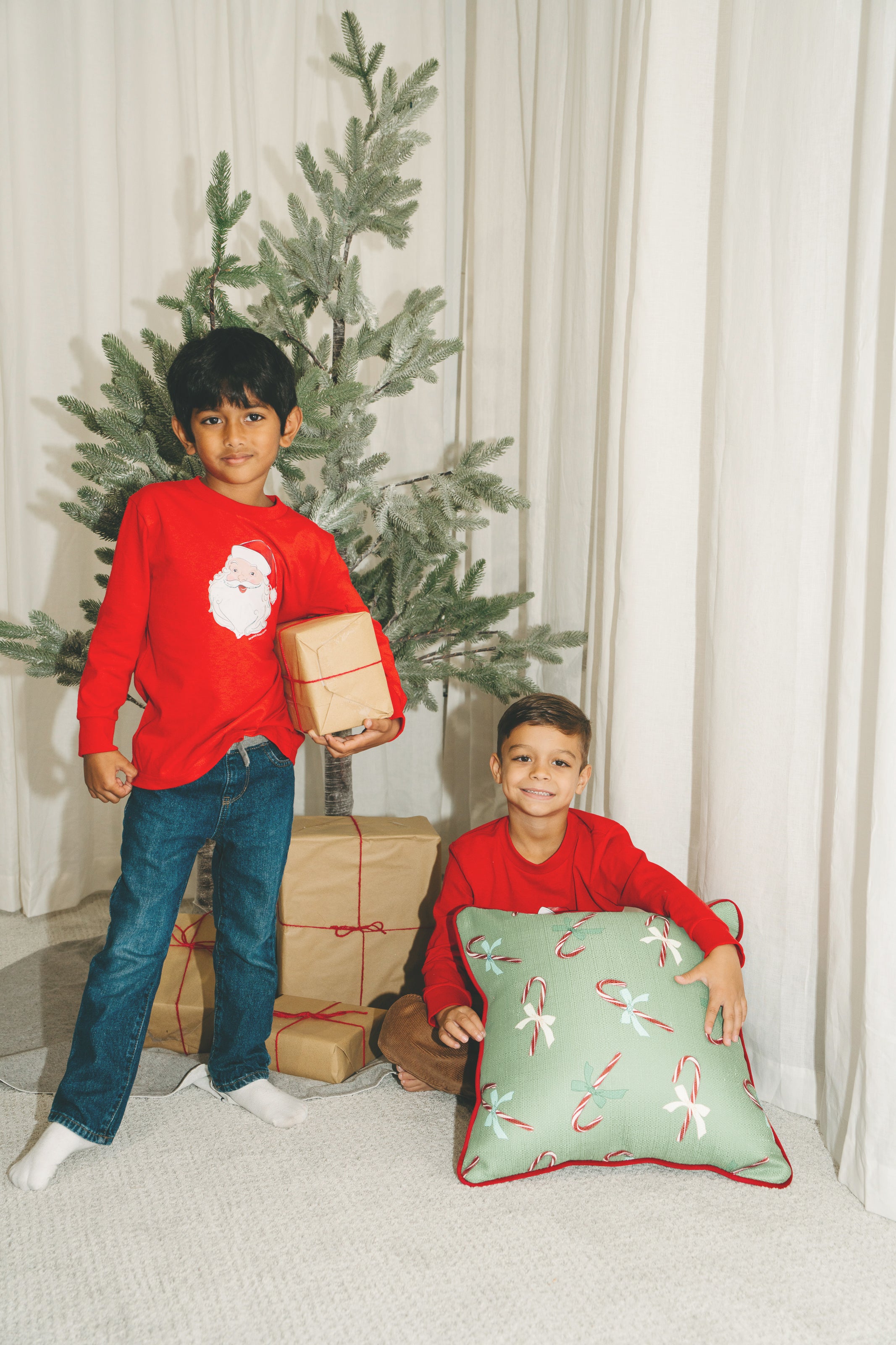 Text in cursive reads “we’re sew glad you’re here,” centered on a gray-blue plaid background with dashed lines and a dark blue shape outlining the text.
