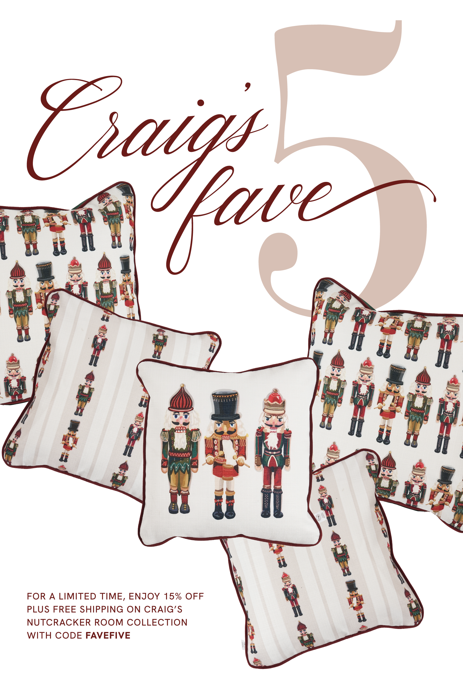 Craig's Fave Five Bundle includes: 2 Oversized Nutcracker Lineup Pillows, 2 Neutral Nutcracker Pillows + 1 Nutcracker Holiday Pillow.