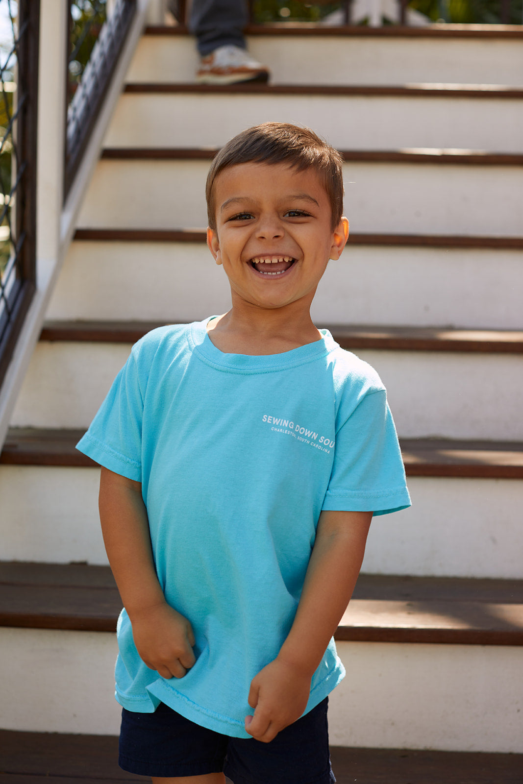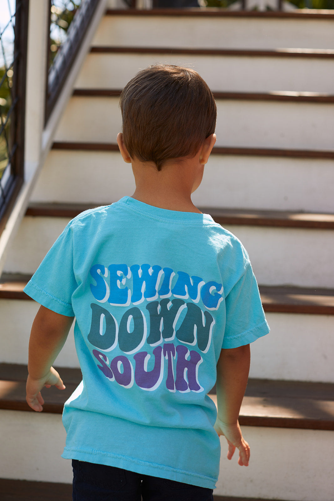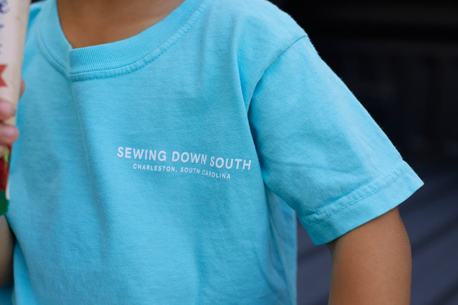 Text in cursive reads “we’re sew glad you’re here,” centered on a gray-blue plaid background with dashed lines and a dark blue shape outlining the text.
